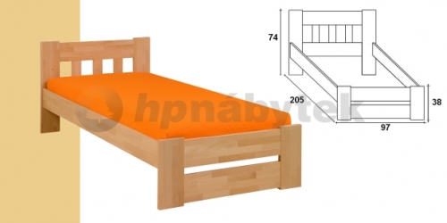 Postel FILIP je bez matrace a roštu, typy a ceny roštů najdete v samostatné kategorii.Tato hezká postel FILIP klasik je vyrobena z masivu buk cink. Postel je určena pro matraci 90x200 cm Rozměry: délka 206 cm,šířka 98 cm, výška čela je 89/43 cm, výška postele je 38 cm.horní hrana bočnice 42 cmvýška uložení roštu : 28,31,33,36 cmprůřez nohy: 30 x 155 mmprůřez bočnice: 30 x 200 mm V nabídce je postel v různých rozměrech.