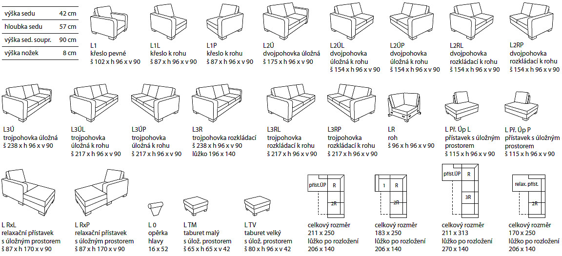 Sedací souprava rohová s kostrou z bukového dřeva, překližky a LTD. U sedací soupravy je velký výběr potahových látek. Opěráky jsou tvořeny z polyuretanových pěn, sedáky z polyuretanových a studených pěn a odpružení zajišťují vlnité pružiny. Souprava může být rozkládací nebo s úložným prostorem. Nabízíme možnost dokoupení křesla či taburetu. Rozměry sestavy: 211 x 250 cm, výška 90 cm. Je možné doobjednat zasunovací opěrky hlavy. Výška sedu: 42 cmHloubka sedu: 57 cmŠířka područek: 21 cm Rozměry křesla (š x h x v): 102 x 96 x 90 Rozměry taburetu (š x h x v): provedení: 65 x 65 x 42ČESKÝ VÝROBEK.