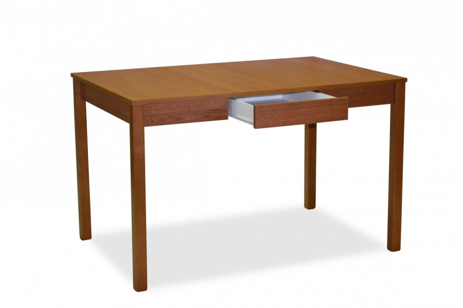 GASTRO - jídelní stůl se zásuvkou.Rozměry: výška 75 cm, šířka 120x80 cm.Provedení: bílá, javor,buk,olše,třešeň,rustikal,tm.hnědá,dub sonoma, dub canyonDeska stolu: lamino 18 mm.Hrany: ABS 2 mm.Stůl lze vyrobit i v atypických rozměrech.