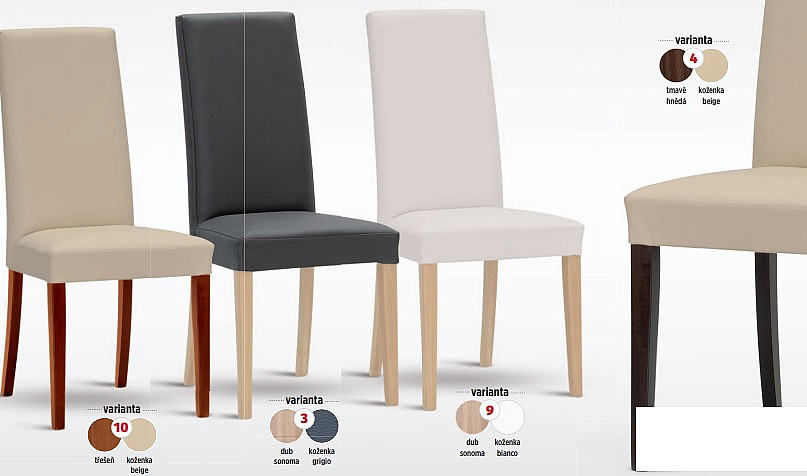 NANCY - moderní celočalouněná židle.Velmi pohodlná, snadná údržba.Nosnost : 120kgROZMĚRY: výška 98 cm, výška sedu 47 cm, šířka 47 cm, hloubka 41 cm.PROVEDENÍ: dřevo + koženka nebo dřevo + látkaPouze v těchto barevných kombinacích:3 - dub sonoma + koženka grigio4 - tm. hnědá + koženka beige9 - dub sonoma + koženka bianco 10 - třešeň + koženka beigeProsíme při objednávce zvolit jednu z těchto barevných variant. Číslo varianty uveďte v poznámce. Jiné kombinace nejsou možné.