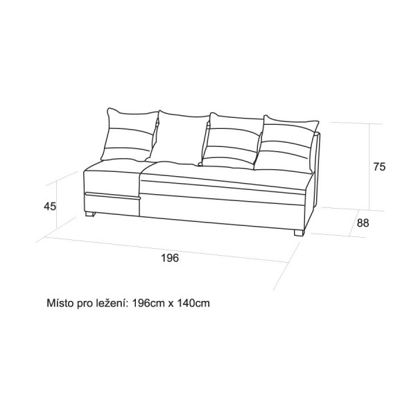 Látky v mnoha barevných variantách. První látka je na pohovku a druhá látka je na polštáře (viz foto). Uveďte Váš výběr do poznámky.Na hlavním obrázku je pohovka v provedení: pohovka 2313 Casablanca + polštáře 712 Tanzania (tyrkys), a na vedlejším obrázku je v provedení: pohovka 723 Kongo + polštáře 725 Kongo (hnědá).ROZMĚRY:- délka 193 cm,- hloubka 90 cm,- hloubka sedu bez polštářů 70 cm,- hloubka sedu s polštáři 50 cm,- výška s polštáři 90 cm,- výška bez polštářů 70 cm,- výška sedu 42 cm,- spací plocha 193x135 cm,- tloušťka polětáře 20 cm.Míry se mohou lišit +/- 5 cm.