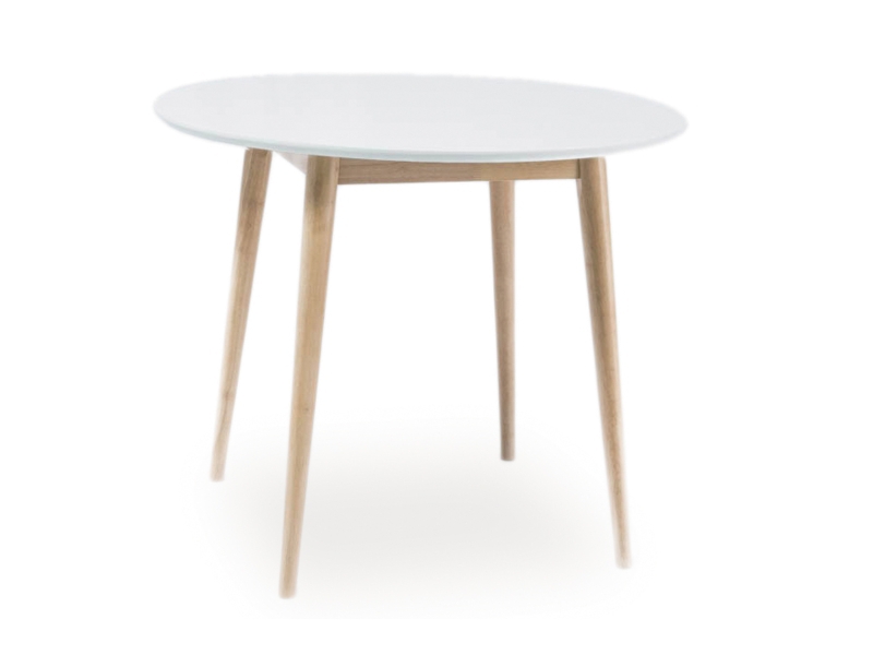 SI-594 - jednoduchý kulatý jídelní stůl ve skandinávském stylu.Materiál: deska stolu MDF + dřevěný rám.Provedení: bílá + bělený dub.Rozměry: průměr 90 cm, výška 75 cm.