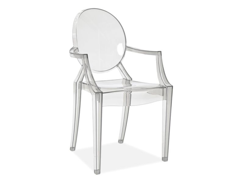 SI-772 - jídelní židle vhodná do moderního designového interiéru.Jemná plná šarmu a půvabu.Materiál: polykarbonát.Provedení: transparentní (průhledná) Rozměry: výška 92 cm, výška sedu 47 cm, hloubka 42 cm, šířka 54 cm.