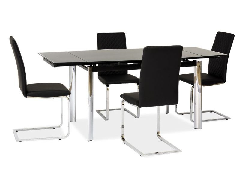 SI-927 - elegantní rozkládací jídelní stůl.Materiál: deska stolu tvrzené sklo + kovový rám.Provedení: černá + chrom.Rozměry: šířka 120 (180) cm, hloubka 80 cm, výška 76 cm.