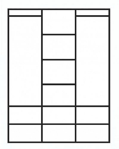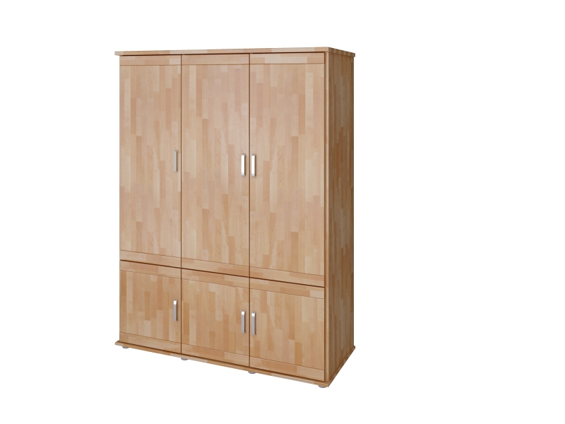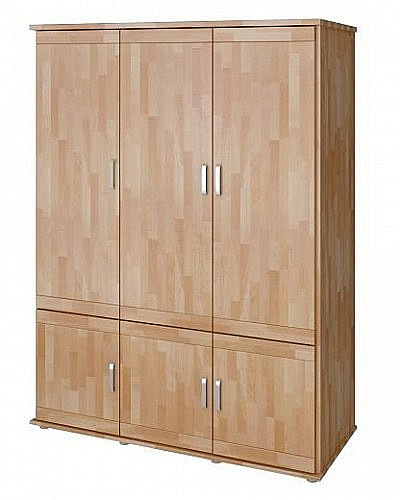 Trojdílná skříň Alfa má v bočních částech šatní tyče a ve středu police, ve spodní části další poličky. Povrchově upraveno bezbarvým UV lakem s vysokou odolností a barevnou stálostí.