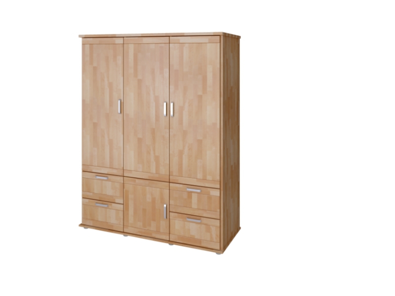 Trojdílná skříň Alfa má v bočních částech šatní tyče a ve středu police, ve spodní části prostorné zásuvky. Povrchově upraveno bezbarvým UV lakem s vysokou odolností a barevnou stálostí.