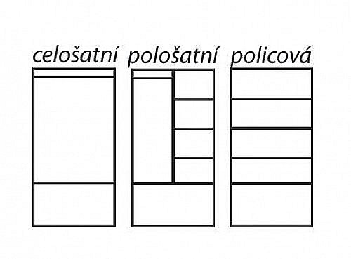 Možnost provedení jako celošatní, pološatní a s policemi. Ve spodní části zásuvky. Povrchově upraveno bezbarvým UV lakem s vysokou odolností a barevnou stálostí.