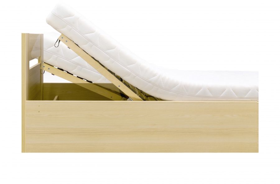 LOTA - zvýšené lůžko s úložným prostorem ve 2 variantách (klasické nebo rohové).ROZMĚRY: šířka 95,5 vm, hloubka 205 cm, výška 82 cm, výška lehací plochy 53 cm, lehací plocha 90x200 cm.PROVEDENÍ: dub bělený, jasan šedý, javor, buk, olše, bílá struktura, dub natur, akácie skořice, akácie světlá, dub kansas a dalšíU rohové varianty univerzálnost stran -> může být levá i pravá.Cena včetně 28 lamelového roštu.Polohování hlava + nohy.Cena BEZ matrace. Matraci lze dokoupit z naší rozsáhlé nabídky. SKLADEM ROHOVÁ v provedení dub natur.