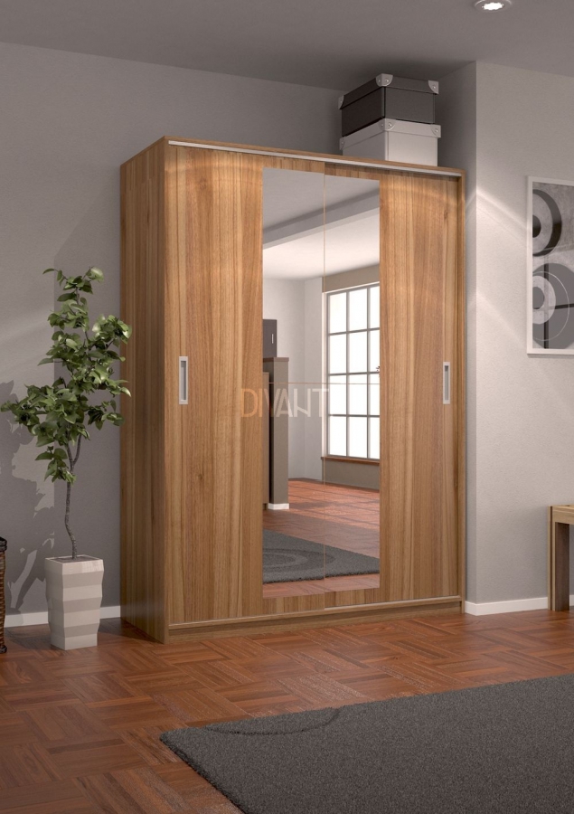 Šatní skříň Alena se zrcadlem a posuvnými dveřmi. Zapuštěné úchytky PESARA 128, dorazové kartáče zdarma.