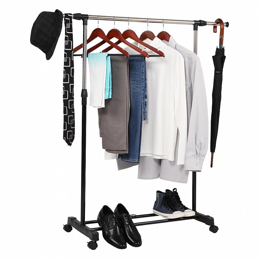 Pojízdný věšák s kolečky a jednou závěsnou výškově nastavitelnou tyčí Materiál: kov / plast Barva: černá Rozměry (ŠxHxV): 80x43x85-150 cm Hmotnost: 1,6 kg Dodávané v demontu.