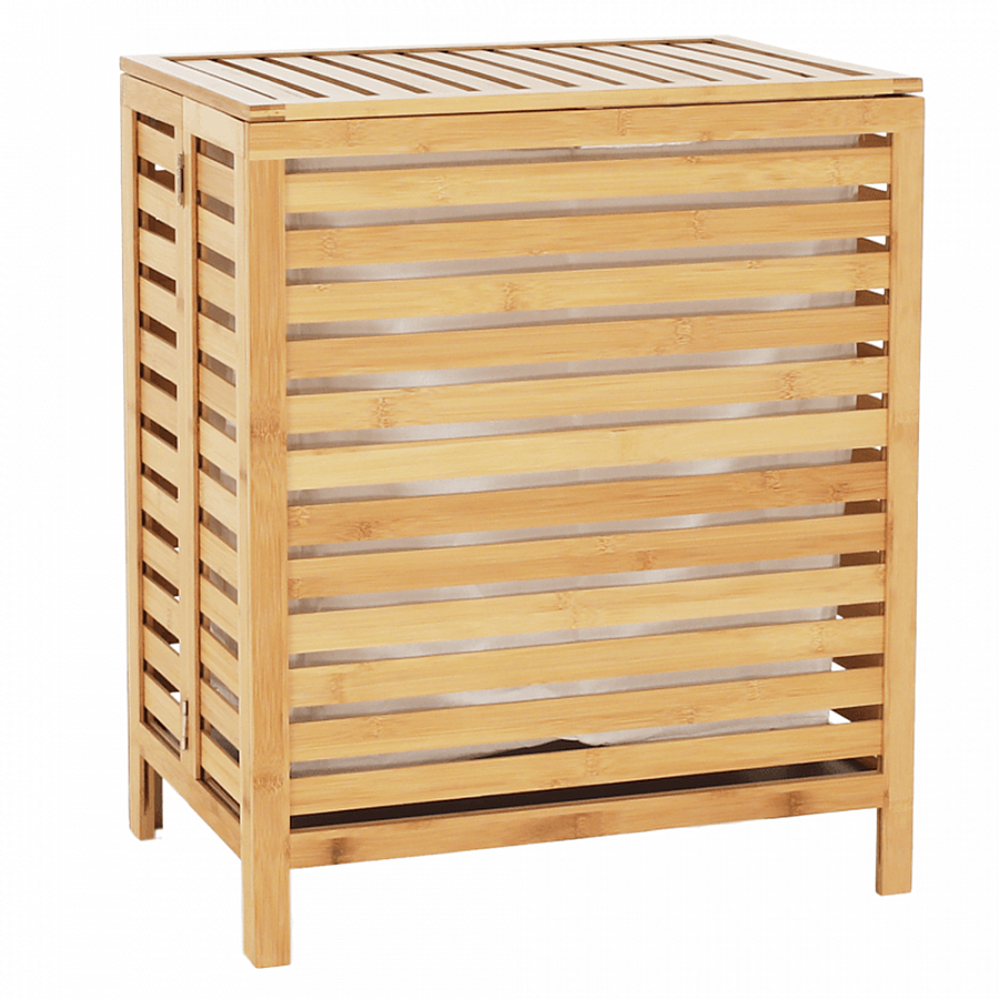 Materiál: bambus / látka Farba: prírodná Rozmery (ŠxHxV): 50x35x60 cm Vyberateľné látkové vrece Látkové krajiny môžu prať v práčke Objem: 105 litrov Odvetrávaný úložný priestor Úložný priestor rozdelený na dve časti Dodávané v monte