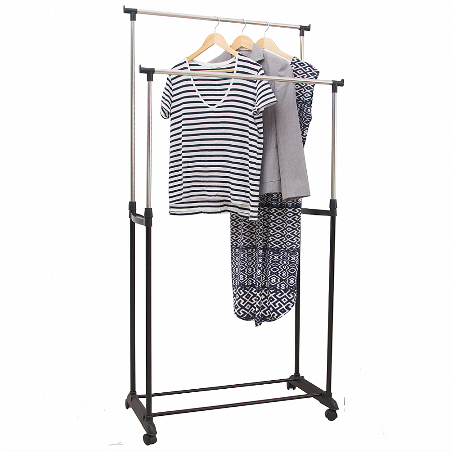 Materiál: nerezová ocel / kov / plast Provedení: černá / stříbrná Rozměry (ŠxHxV): 80x42x165 cm pohyblivá konstrukce S policí Dvě věšáková tyče S kolečky Dvě kolečka s brzdou pastové kolečka Dodávané v demontu