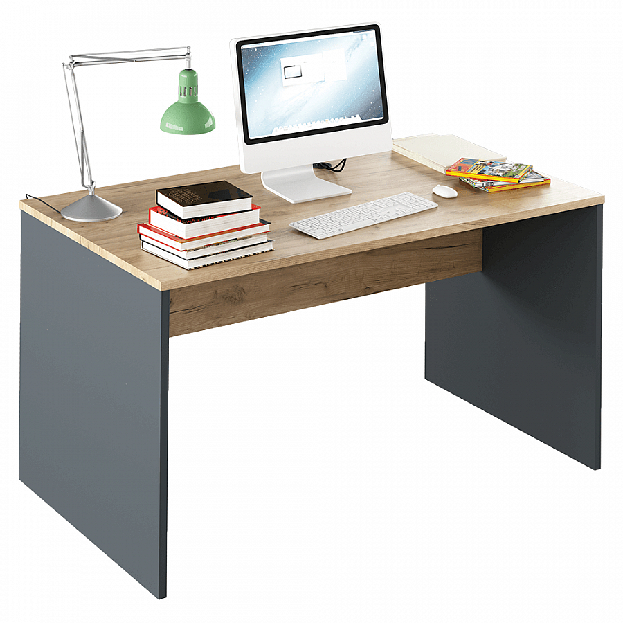 Psací stůl RIOMA NEW TYP 11 Barevné provedení: grafit / dub artisan Materiál: DTD laminovaná Rozměry (ŠxHxV): 140x80x76 cm Tloušťka materiálu: 22 mm Dodávané bez kontejneru, kontejner je možné si dokoupit Dodávané v demontu.