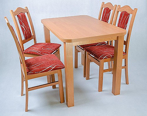 Jídelní set z masivního dřeva v provedení olše. Na výběr jsou tři odstíny sedáků židlí a zad – béžová, červená nebo hnědá.