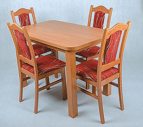 Jídelní set z masivního dřeva v provedení olše. Na výběr jsou tři odstíny sedáků židlí a zad – béžová, červená nebo hnědá.