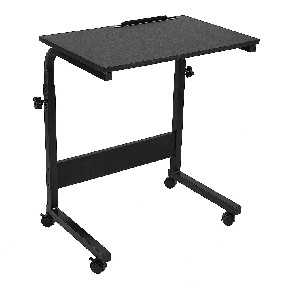 Materiál: MDF s PVC fólií / kov Barva: černá Rozměry (ŠxHxV): 60x40x70-90 cm Nosnost: 15 kg Tloušťka plátu: 1,5 cm pojízdný na kolečkách Se dvěma brzdami Nastavitelná výška stolu Se zářezem na tablet Dodáván v demontu