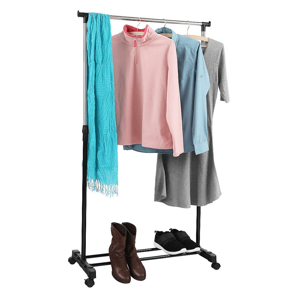 pojazdný věšák s kolečky a jednou závěsnou výškově nastavitelnou tyčí, provedení: nerezový kov + černý plast, rozměry ŠxHxV: 75,5x43x92-159 cm